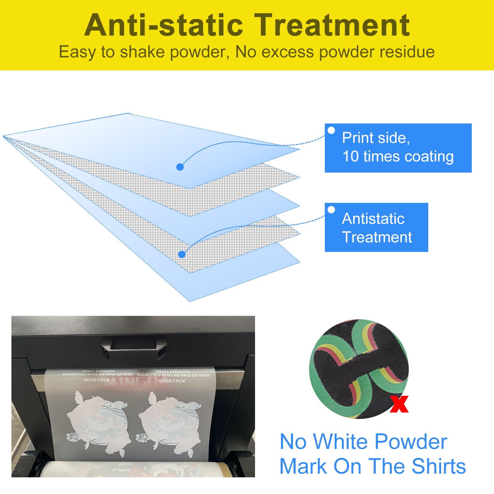 【Static Free】Yamation PET film sheets DTF is specially treated to be Static Free. No powder residue after shaking.